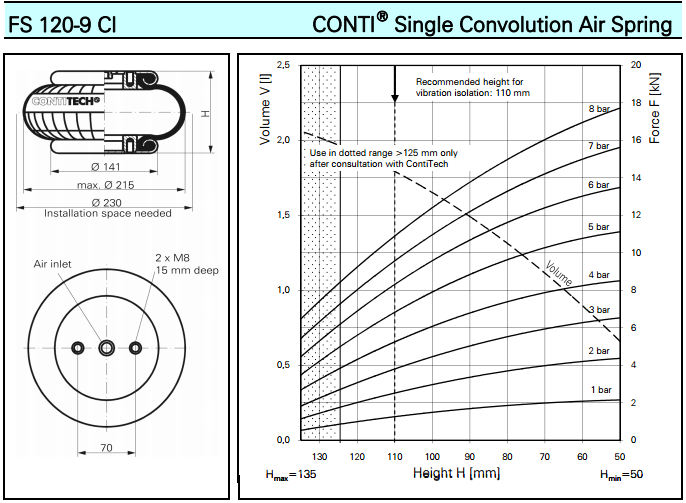 橡膠氣囊工作時,內(nèi)腔充入壓縮空氣,形成一個壓縮空氣氣柱。隨著振動載荷量的增加,彈簧的高度降低,內(nèi)腔容積減小,彈簧的剛度增加,內(nèi)腔空氣柱的有效承載面積加大,此時彈簧的承載能力增加。當(dāng)振動載荷量減小時,彈簧的高度升高,內(nèi)腔容積增大,彈簧的剛度減小,內(nèi)腔空氣柱的有效承載面積減小,此時彈簧的承載能力減小。這樣,空氣彈簧在有效的行程內(nèi),空氣彈簧的高度、內(nèi)腔容積、承載能力隨著振動載荷的遞增與減小發(fā)生了平穩(wěn)的柔性傳遞、振幅與震動載荷的高效控制。還可以用增、減充氣量的方法,調(diào)整彈簧的剛度和承載力的大小,還可以附設(shè)輔助氣室,實(shí)現(xiàn)自控調(diào)節(jié)。