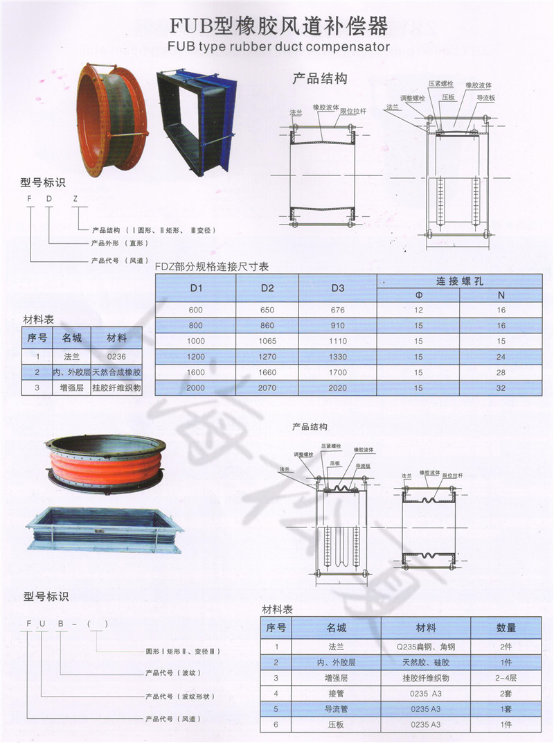 風(fēng)道橡膠補(bǔ)償器分為FDZ、FVB、FUB、XB四種型號,由橡膠和橡膠一纖維織物復(fù)合材料、鋼制法蘭、套筒、保溫隔熱材料組成,主要用于各種風(fēng)機(jī)、風(fēng)管之間的柔性連接,其功能是減震、降噪、密封、耐介質(zhì)、便于位移和安裝,是環(huán)境保護(hù)領(lǐng)域中一種較為理想的減震、降噪、消煙除塵的配套件。